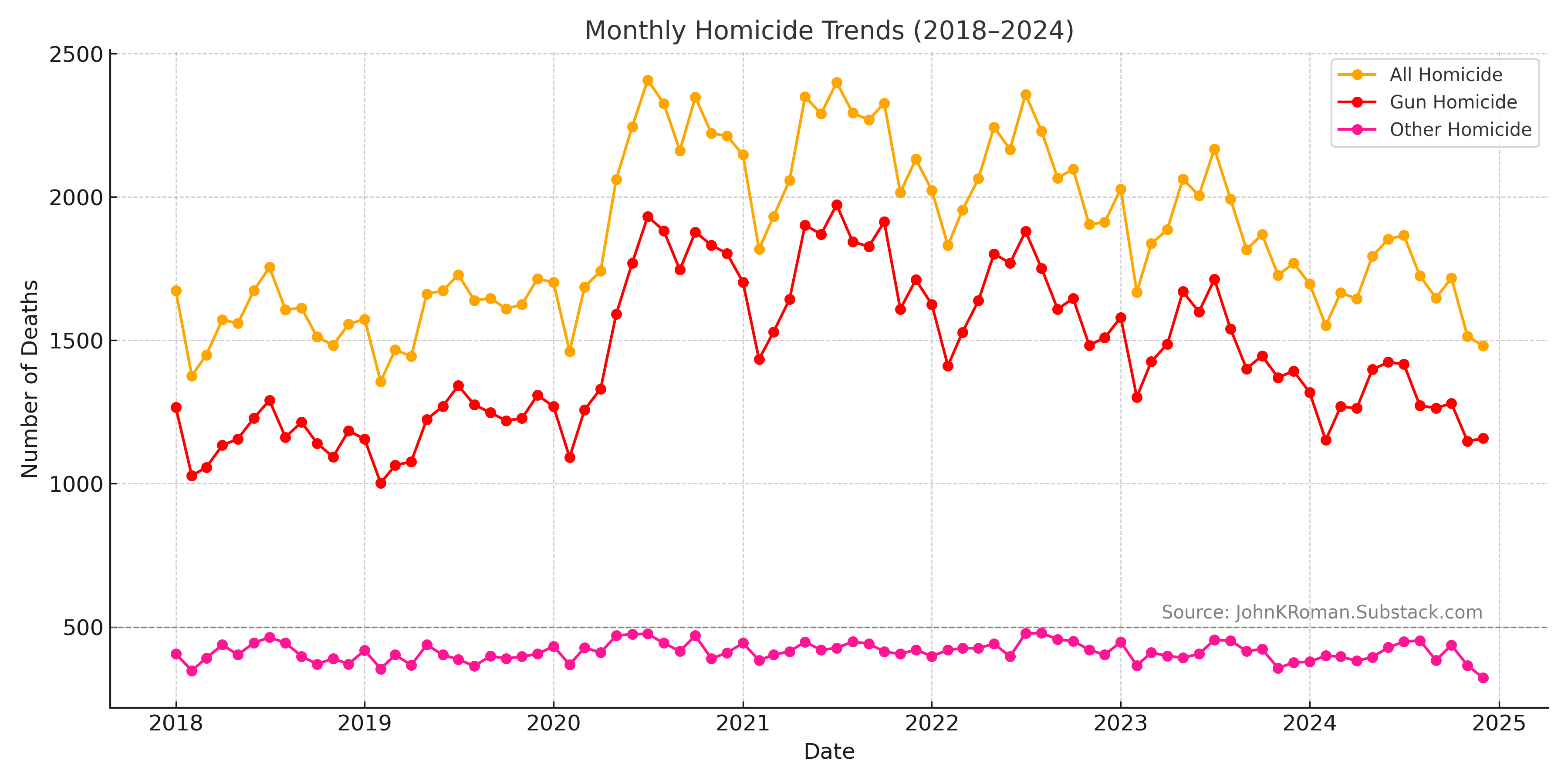 Table 1 summarizes the monthly trend data for 2018-2024. There were 19,141 homicides in the US in 2019, the year before the pandemic, and 24,576 in 2020. The 28.4% increase in homicide from 2019 to 2020 was the largest one-year increase in recorded history, dating back to 1960, and was almost three times larger than the prior biggest one-year increase. Homicide in the US went up again in 2021, to more than 26,000. This is roughly the same number of homicides as in 1993, which was the prior worst year for homicides in America (although there were 80 million fewer Americans in 1993, so the homicide rate was much higher).